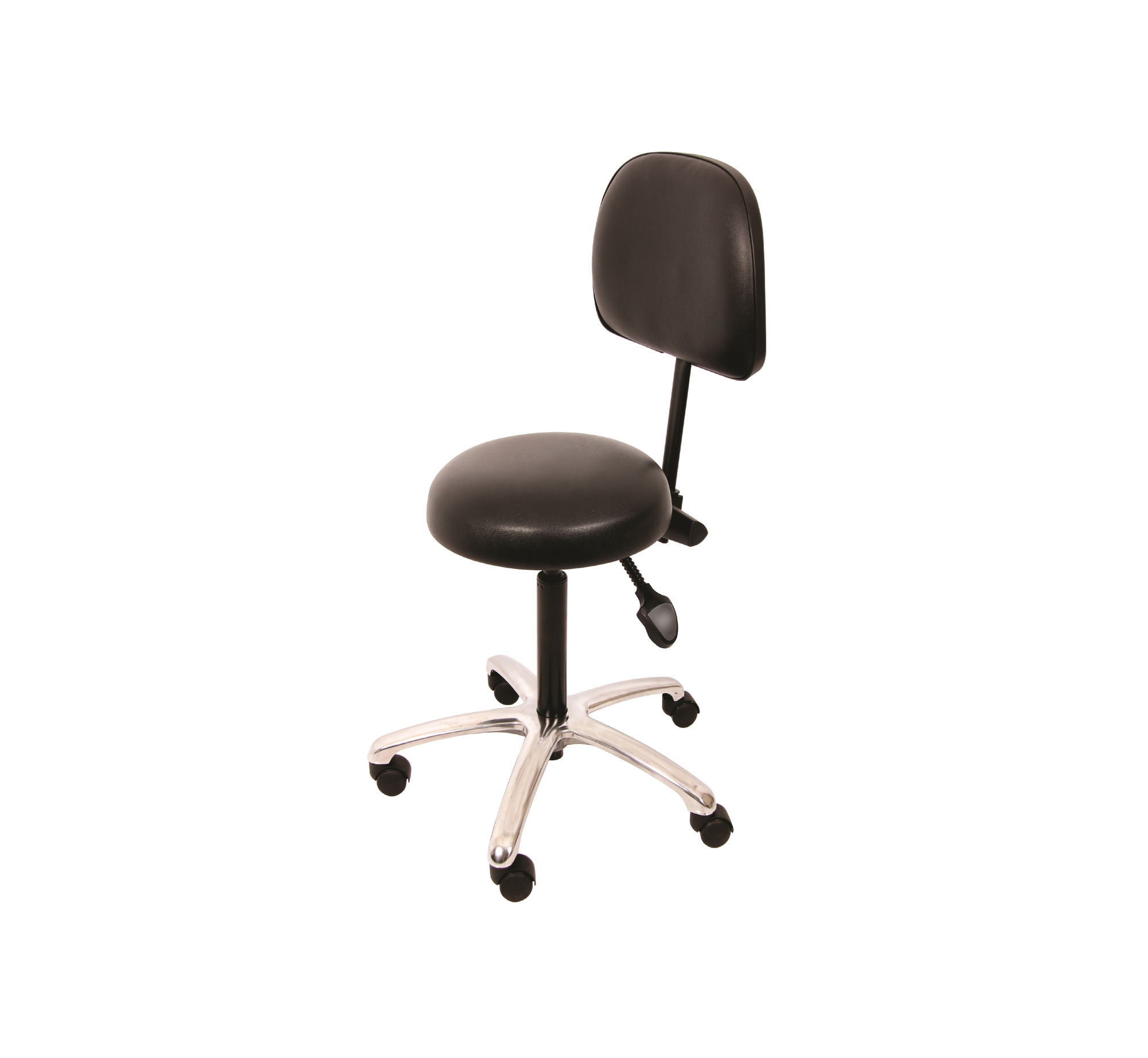 A hand-activated gas-assisted medical stool with a backrest and a hygienic, seamless anti-slip vinyl seat.