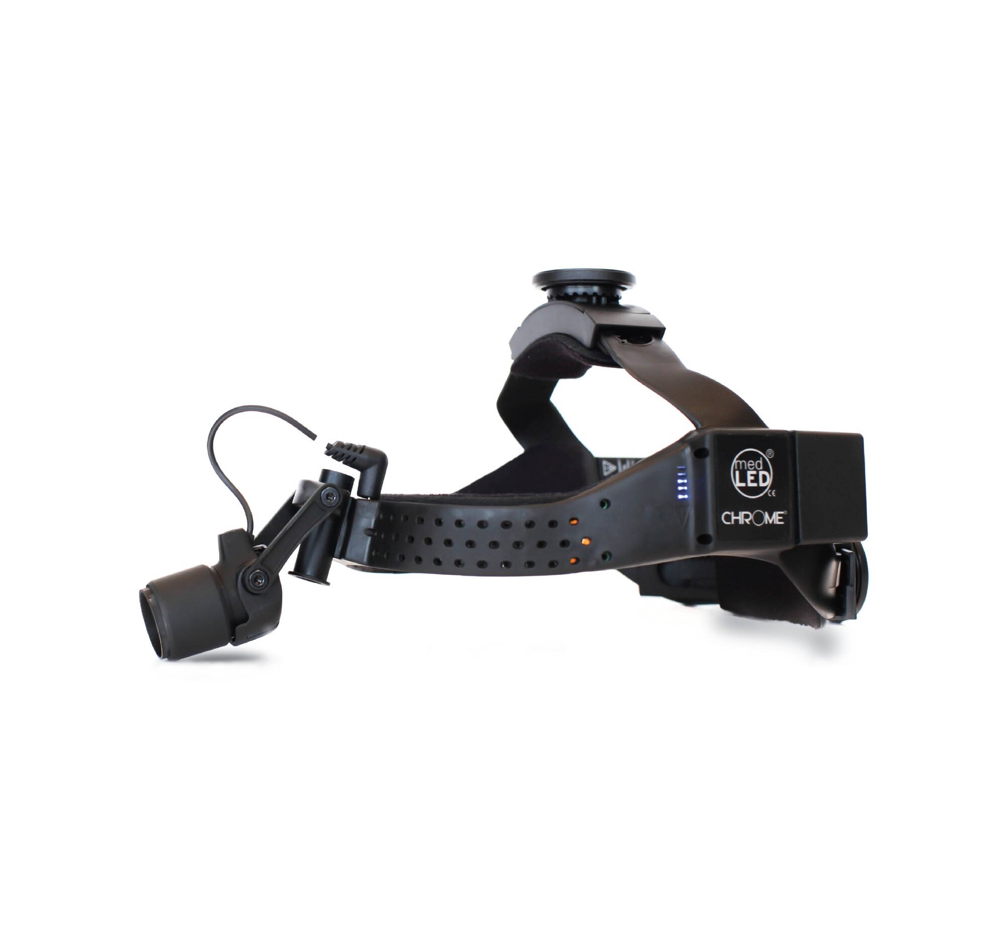 The MedLED Chrome® is the next frontier and the fibre optic headlight replacement. The Chrome headlight is the next generation of the previously supplied Sapphire Headlight. It is so efficient that surgery can be done cord-free at Xenon or Halogen brightness. Alternatively, while competing LED headlights are convenient and affordable, they still fall short with fragile tethered belt battery packs and other problems.